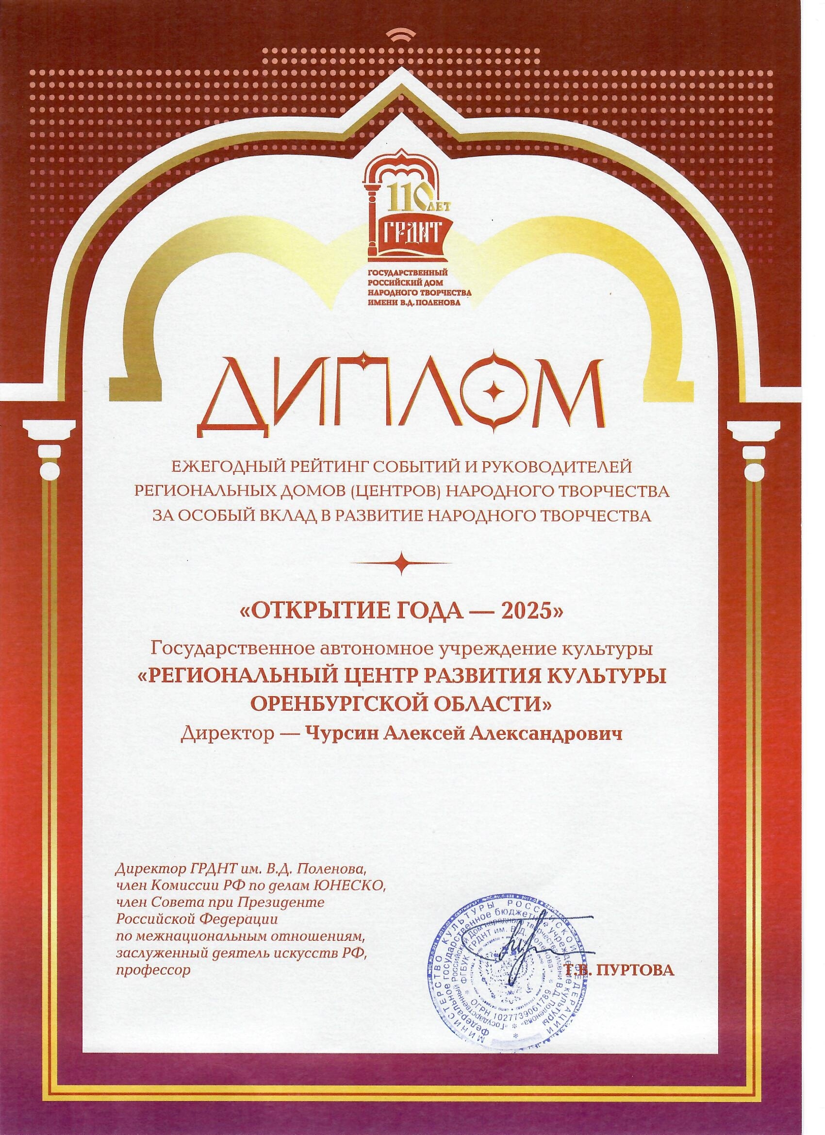 По итогам ежегодного рейтинга событий и руководителей региональным Домов (Центров) народного творчества за особый вклад в развитие народного творчества Региональный центр развития культуры Оренбургской области в лице директора Алексея Чурсина получил диплом в номинации «Открытие года-2025».